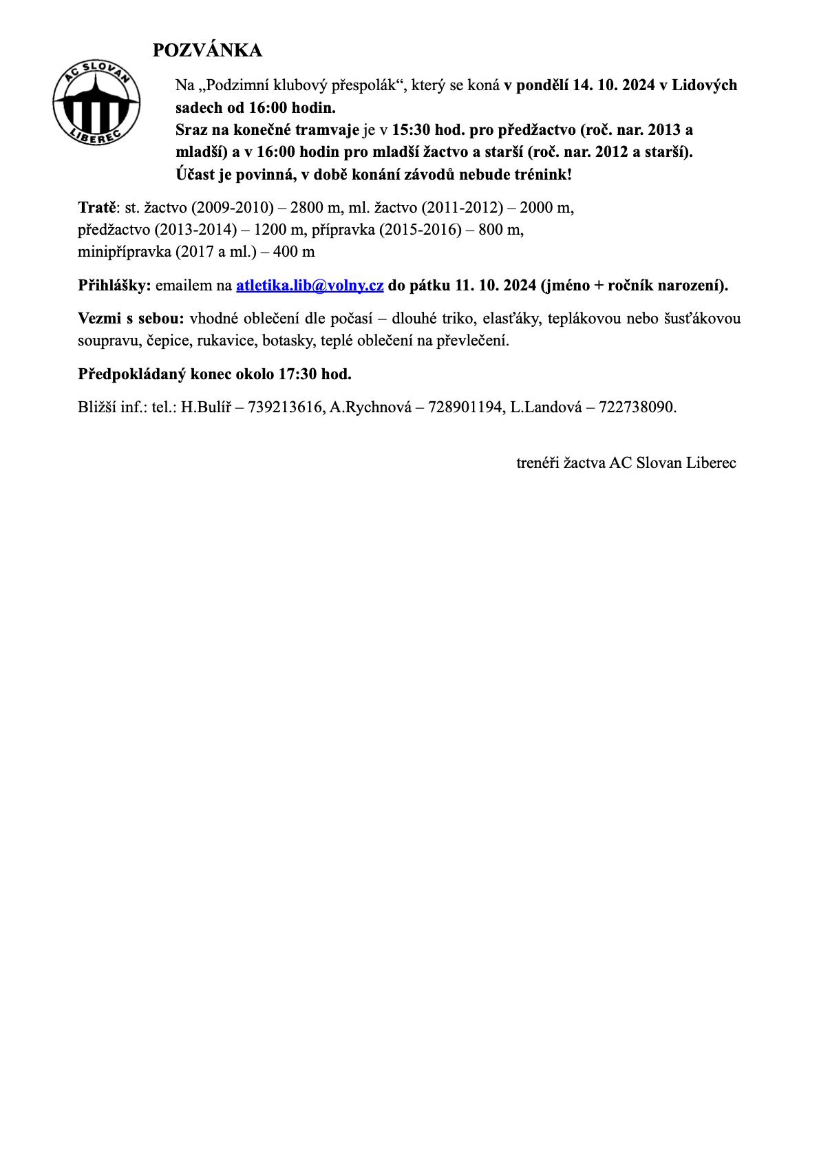Klubový přespolní běh se uskuteční 14.10.2024 jako tradičně v Lidových sadech.